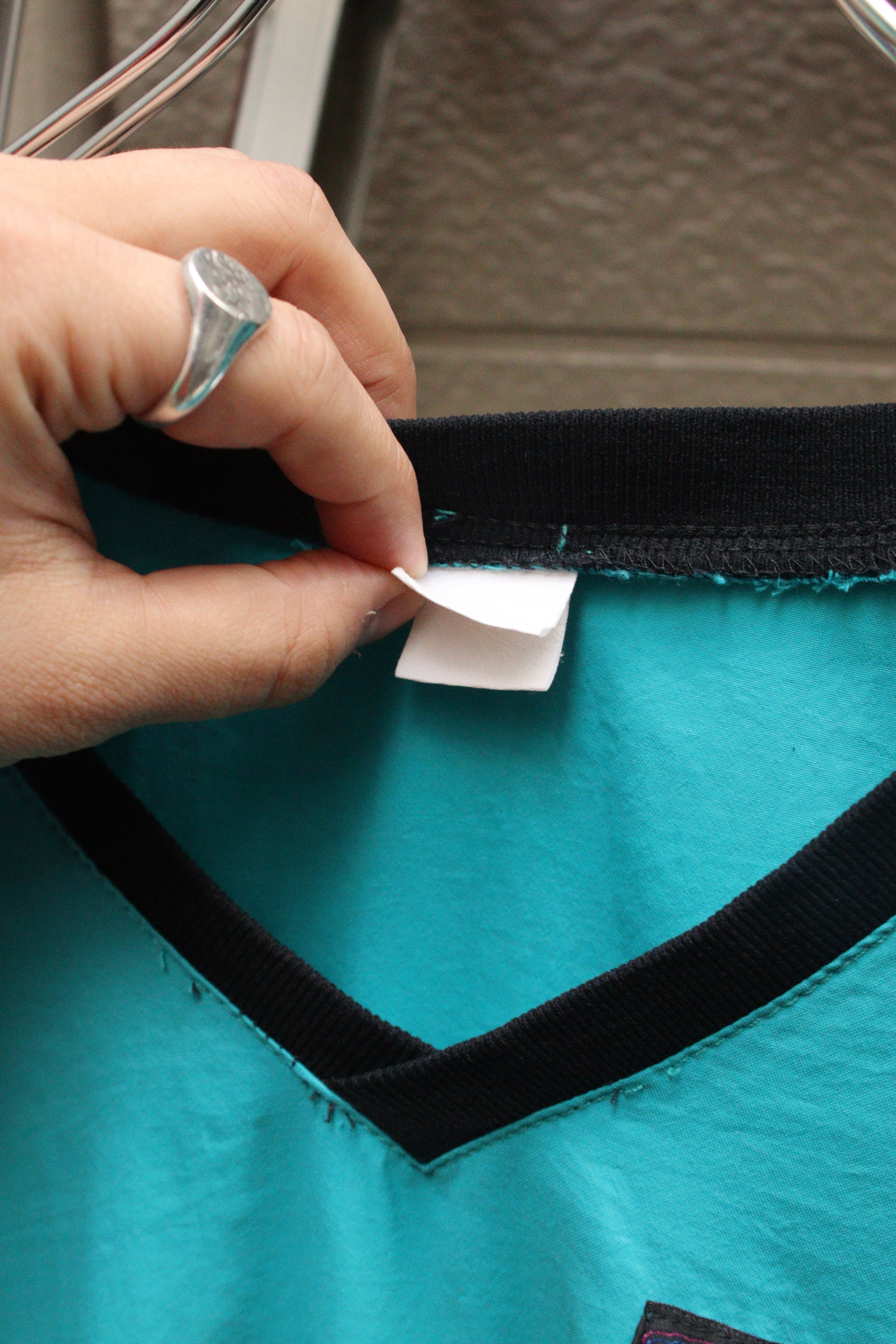 表記が消えておりますが、恐らくpolyesterとcottonの混紡生地かと。少しシャリ感がありマットな光沢感です。
